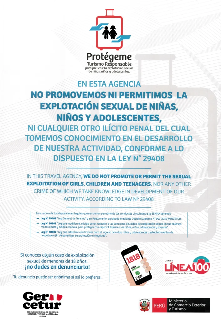 En cumplimiento del Decreto Supremo N.° 005-2020-MINCETUR, que aprueba el Reglamento de Agencias de Viajes y Turismo en el Perú, Peru Viajes Exclusivos E.I.R.L. declara su adhesión y compromiso con el Código de Conducta contra la Explotación Sexual de Niñas, Niños y Adolescentes (ESNNA).